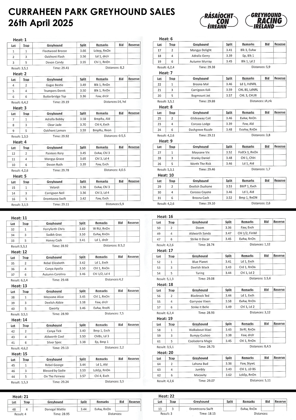 TRIAL RESULTS FOR CURRAHEEN PARK SALES THIS MORNING SATURDAY 26/04/2025