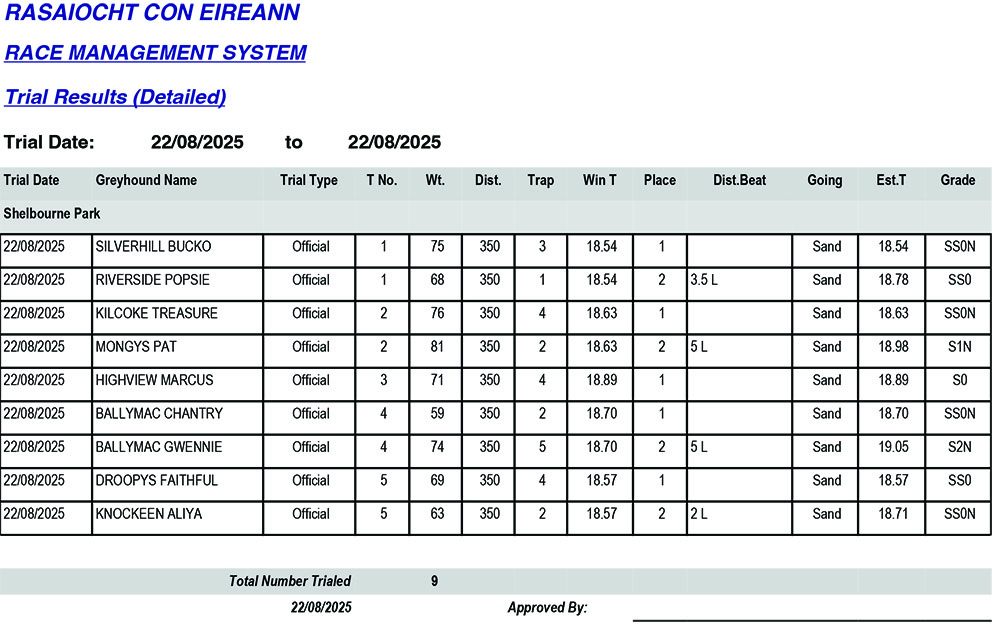 SHELBOURNE PARK TRIAL RESULTS FRIDAY 22/08/2025