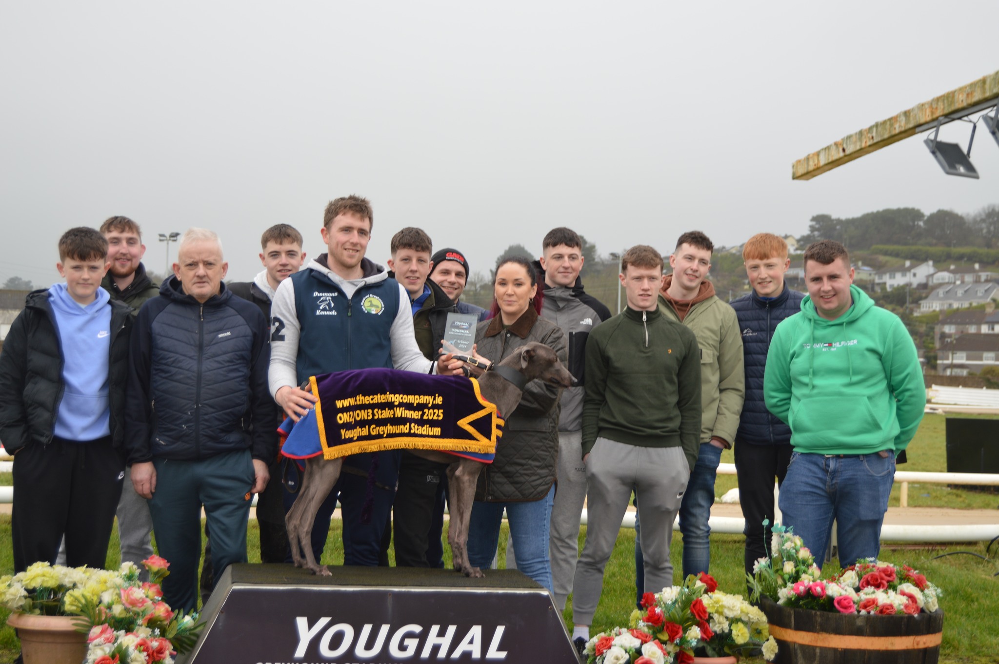Pictured with Michael O'Brien (Handler) Ally O'Keeffe (sponsor) presents the winners trophy to Tim Cliffe (owner) also pictured is Ian Magnier (Youghal Racing Manager) & members of The Seasoned Scammers Syndicate.