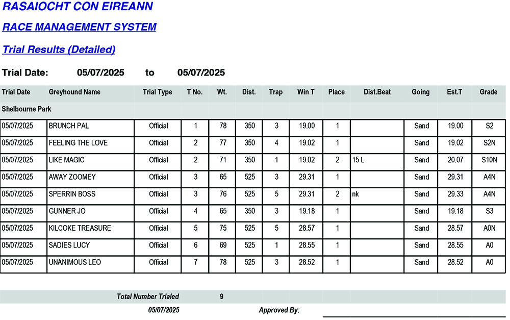 SHELBOURNE PARK TRIAL RESULTS SATURDAY 5/07/2025