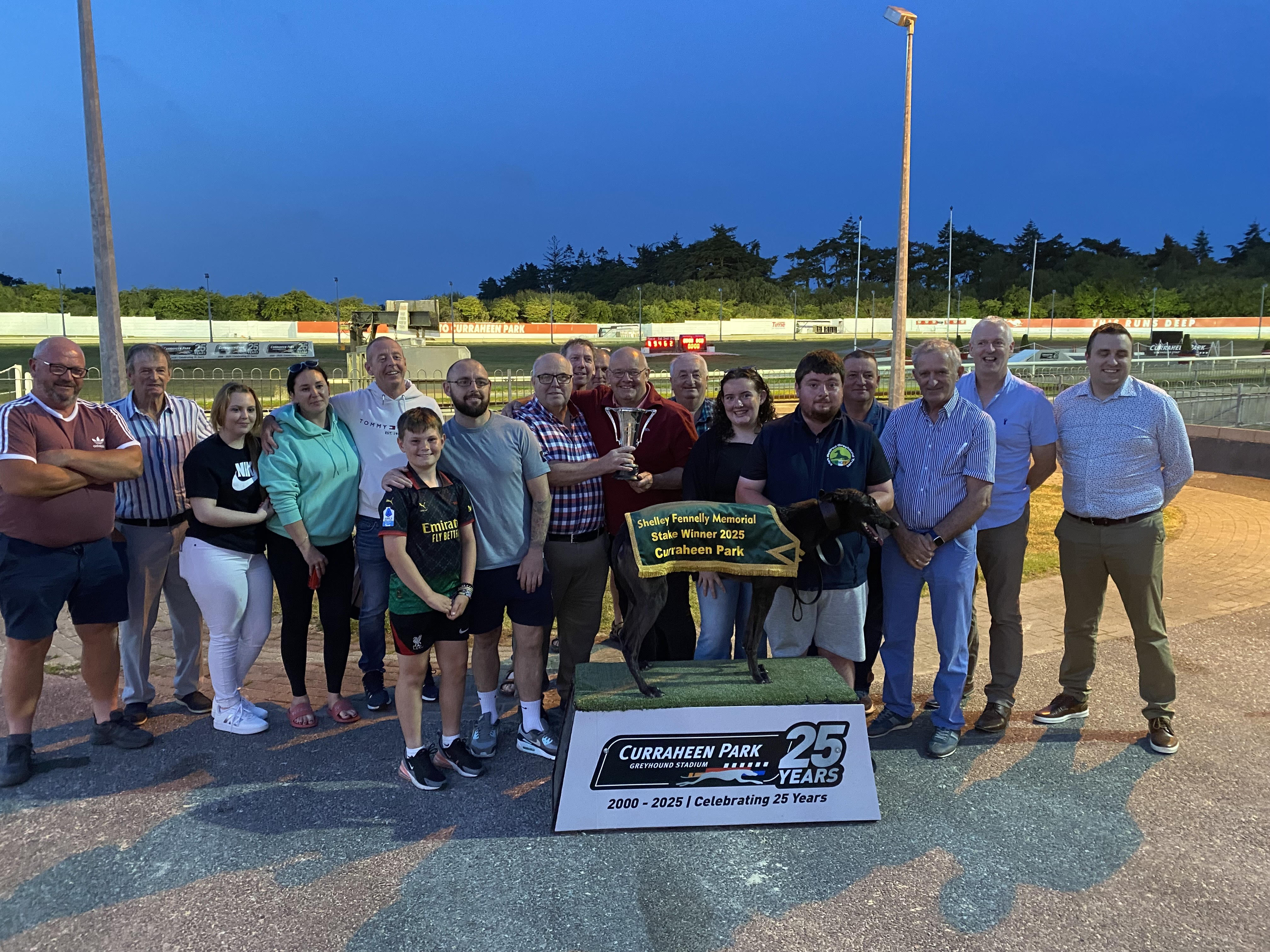 JJ Fennelly makes the winning presentation to owner Mick O’Driscoll after Imokilly Roxanne landed the Shelley Fennelly Memorial Open Bitch Stake. Also included are Brian Collins and Darren Hogan from Curraheen Park Greyhound Stadium along with friends and supporters.