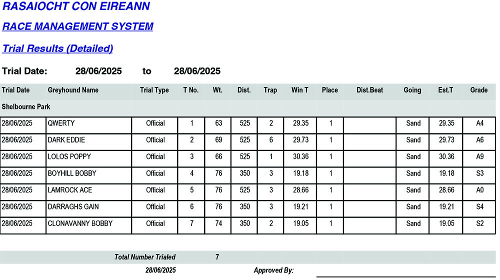 Shelbourne Park Trial Results Saturday 28/06/2025: