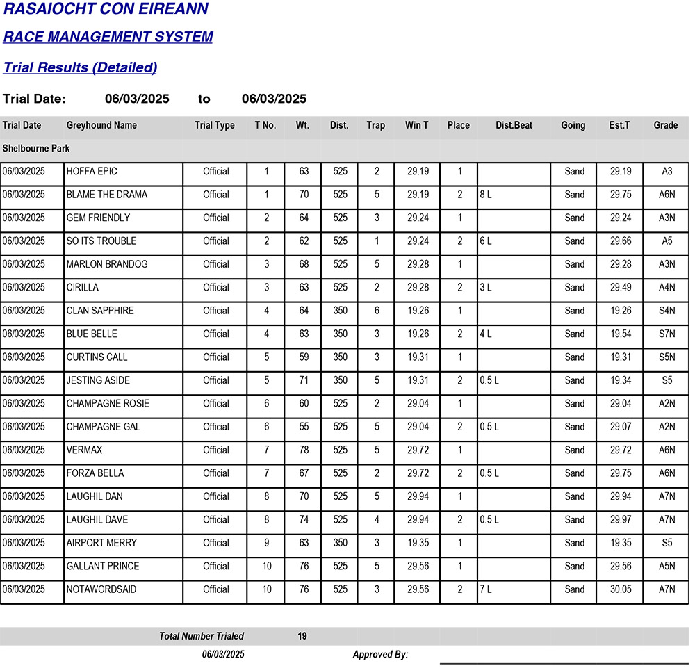 SHELBOURNE PARK TRIAL RESULTS, THURSDAY 6/3/2025