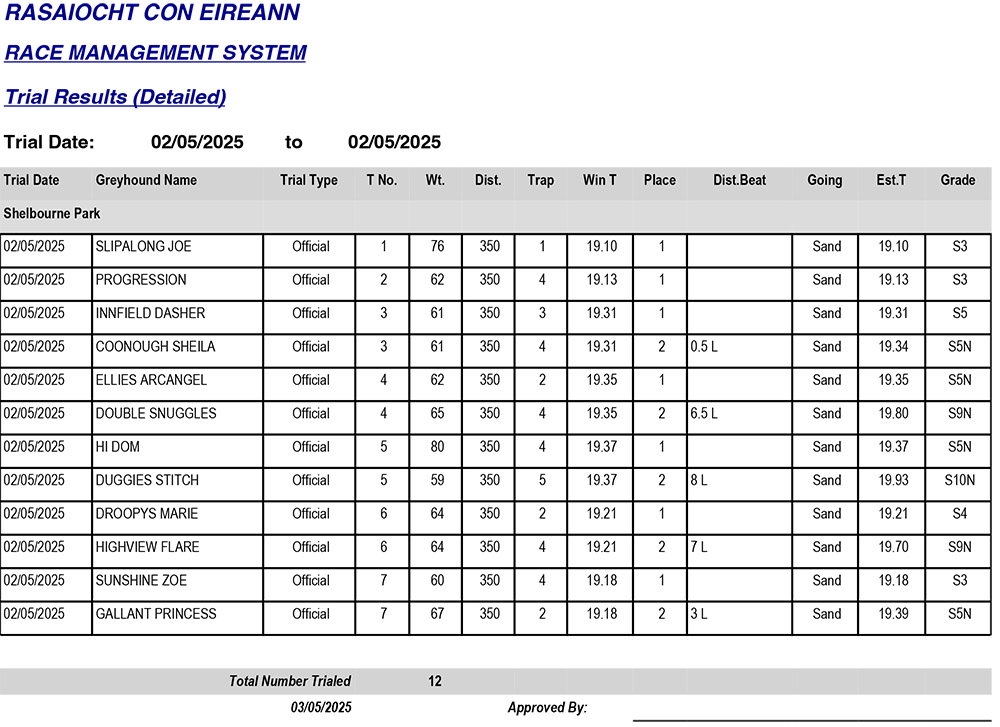 Shelbourne Park Trial Results, Friday 2/5/2025: