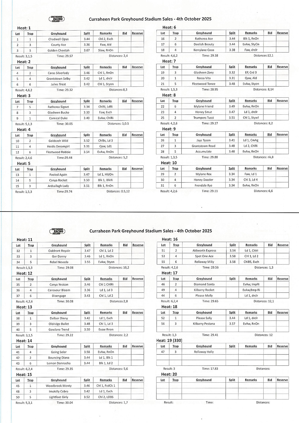 CURRAHEEN PARK GREYHOUND SALES RESULTS – 4th OCTOBER