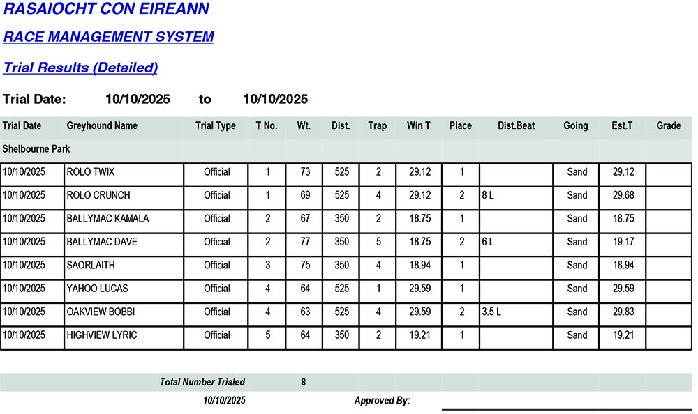 Shelbourne Park Trial Results Friday 10/10/2025:
