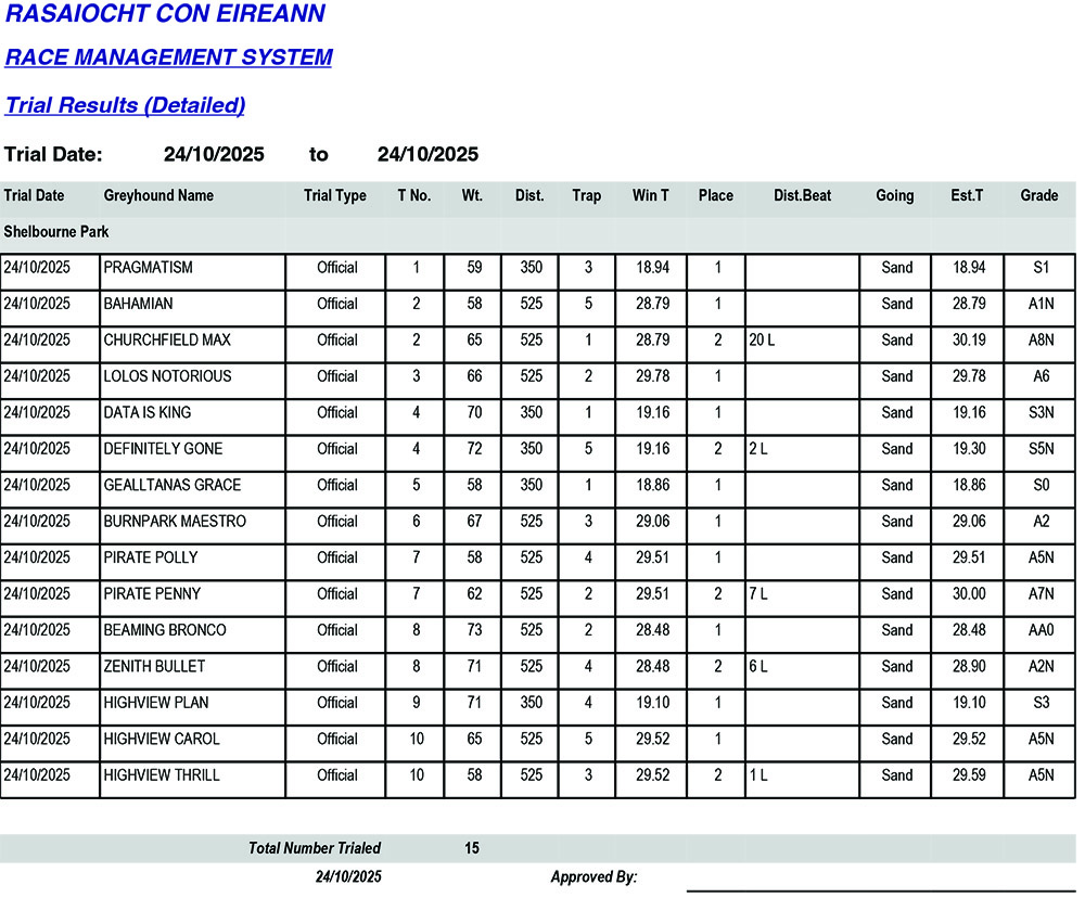 Shelbourne Park Trial Results Friday 24/10/2025: