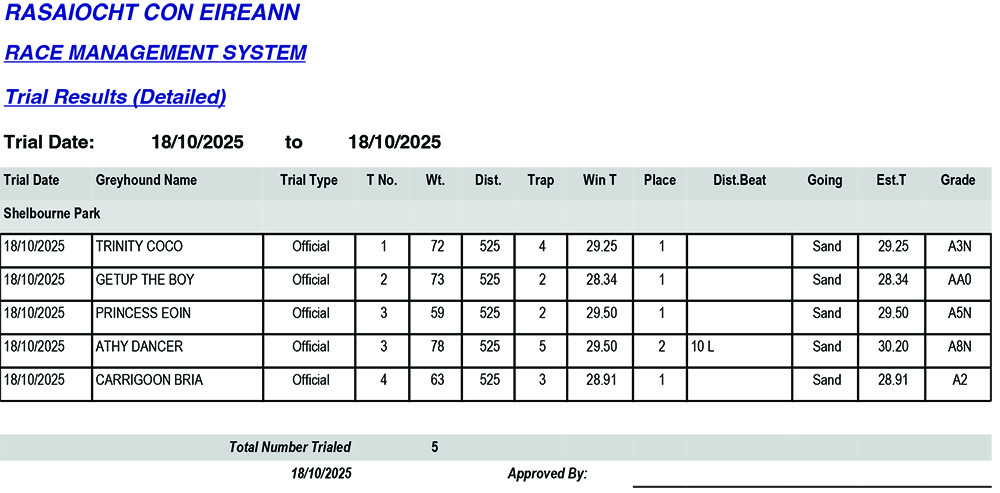 Shelbourne Park Trial Results Saturday 18/10/2025: