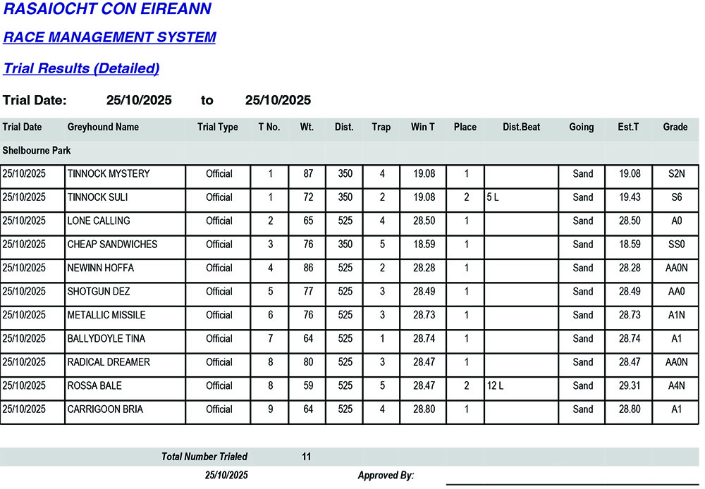 Shelbourne Park Trial Results Saturday 25/10/2025: