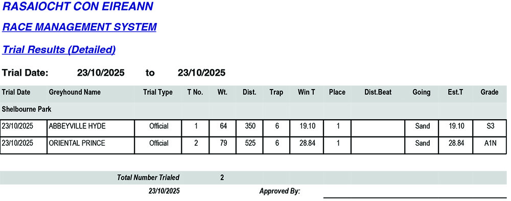 Shelbourne Park Trial Results Thursday 23/10/2025: