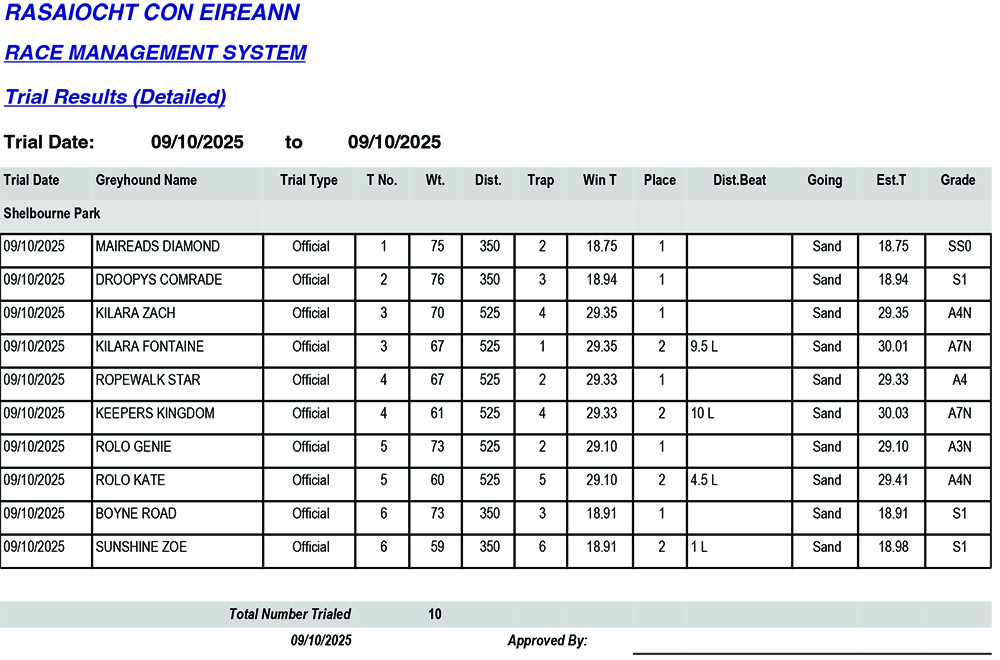 Shelbourne Park Trial Results Thursday 9/10/2025: