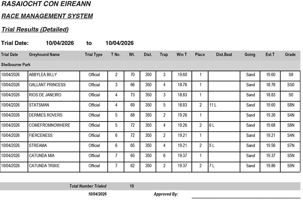 Shelbourne Park Trial Results Friday 10/4/2026:
