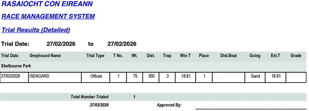 Shelbourne Park Trial Results Friday 27/2/2026: