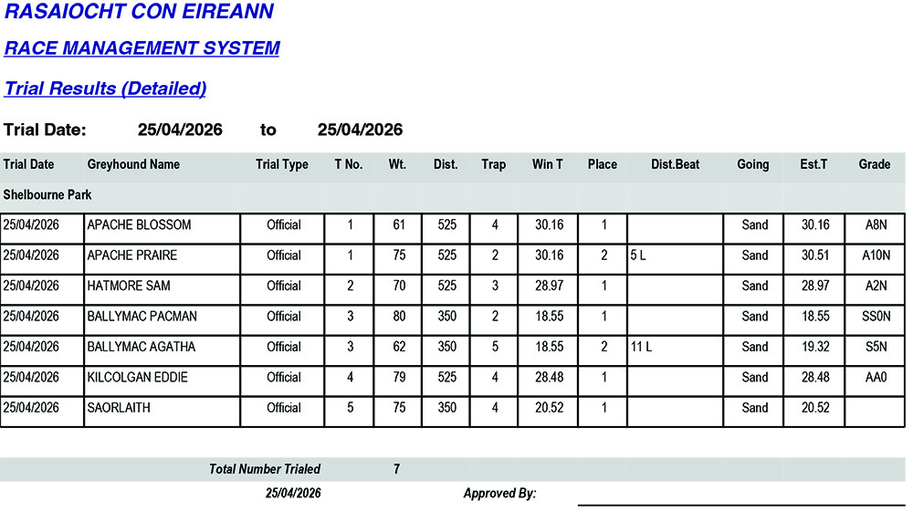 • SHELBOURNE PARK TRIAL RESULTS SATURDAY 25/4/2026