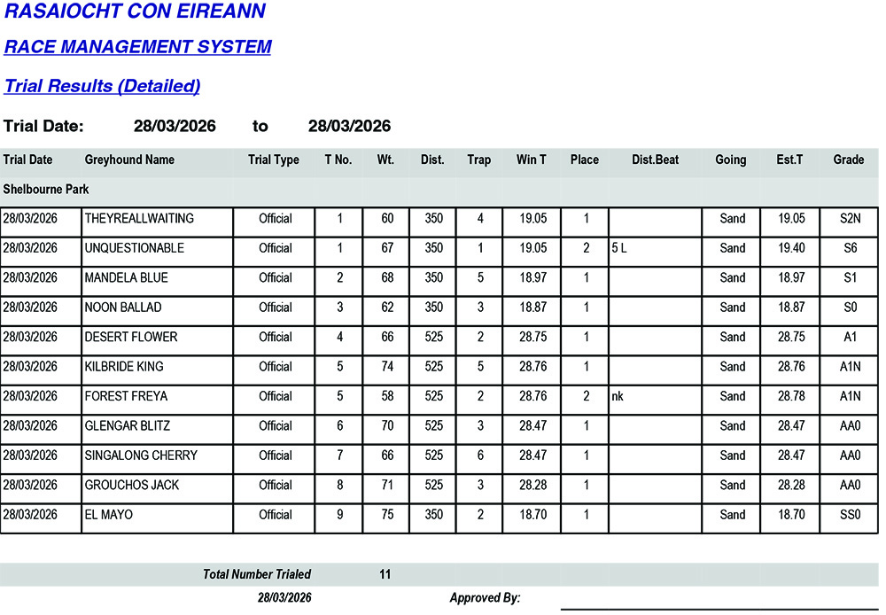 Shelbourne Park Trial Results Saturday 28/3/2026: