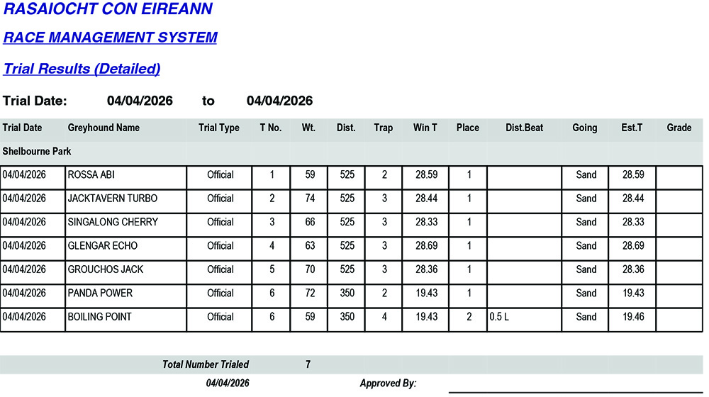 Shelbourne Park Trial Results Saturday 4/4/2026: