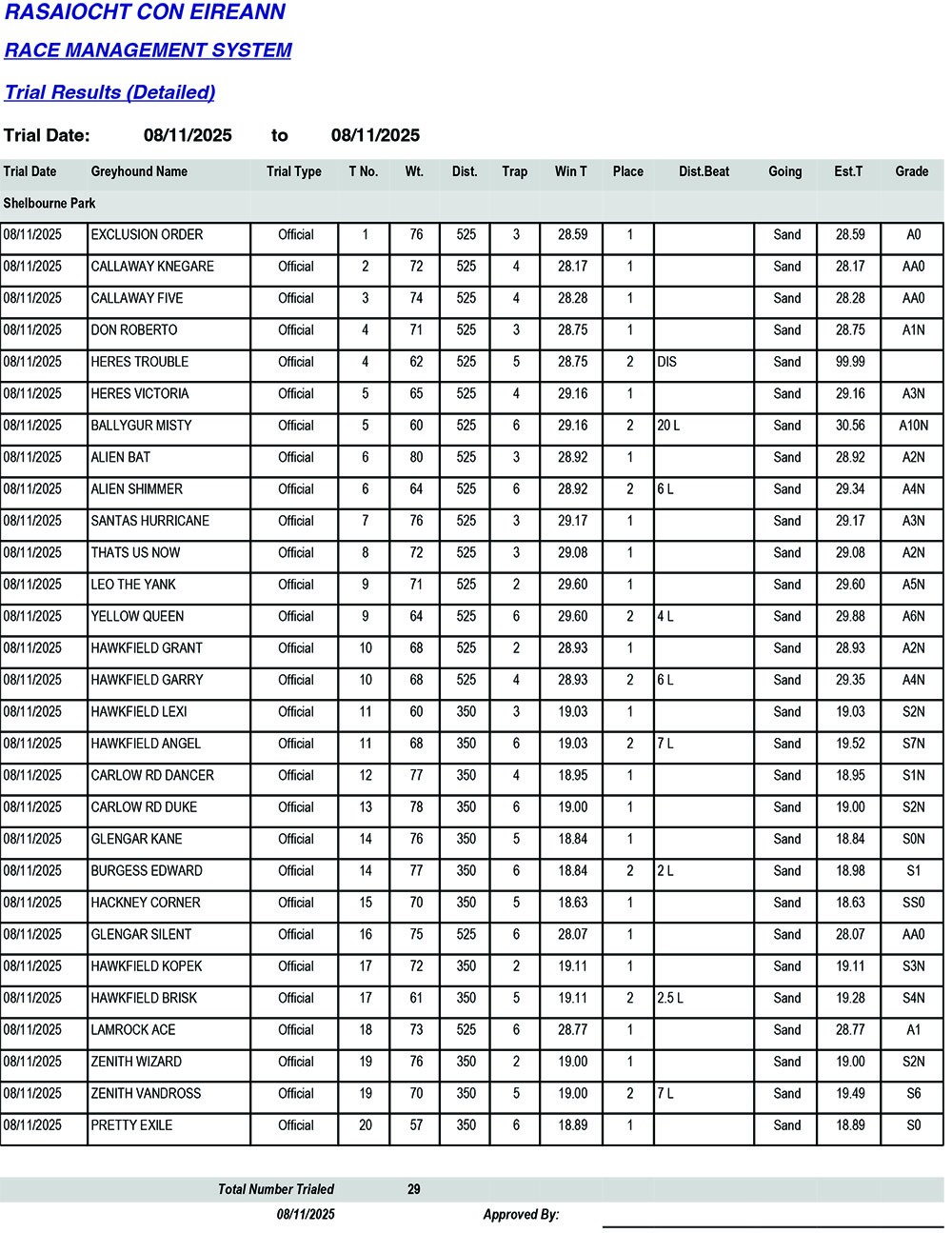 Shelbourne Park Trial Results Saturday 8/11/2025:
