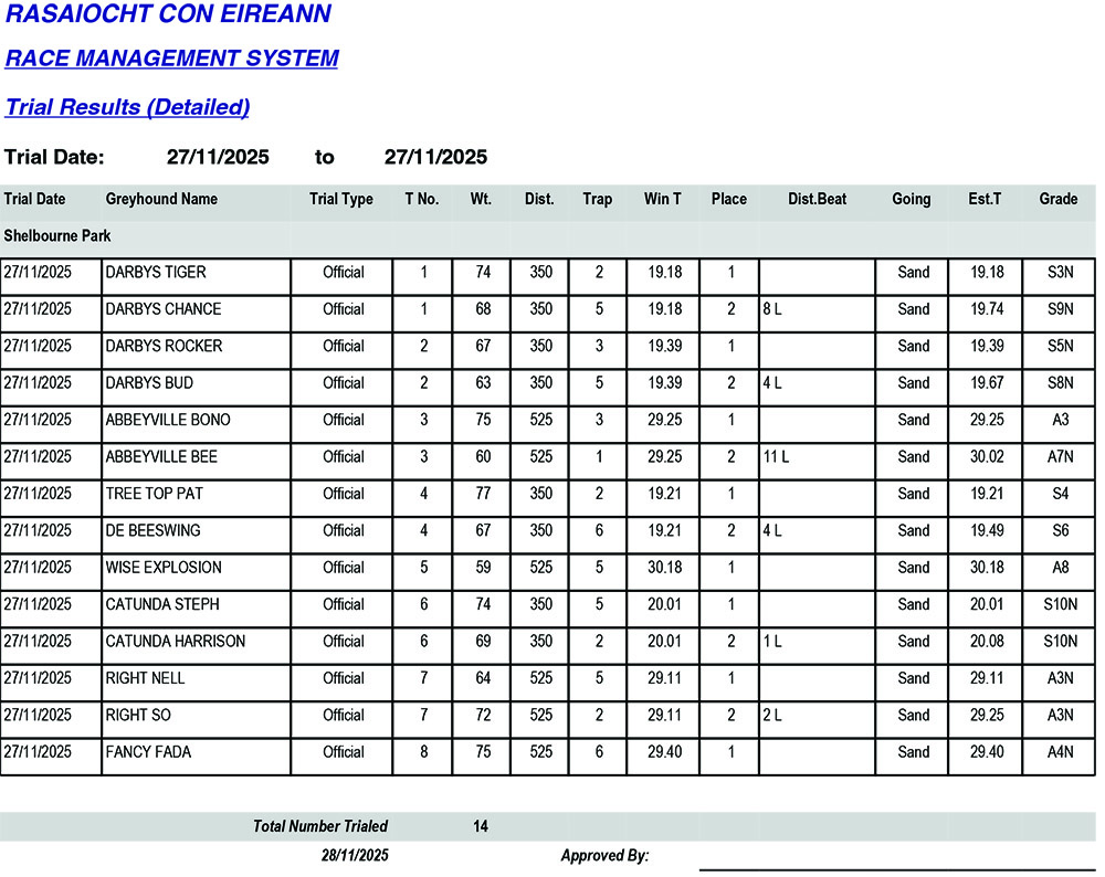 Shelbourne Park Trial Results Thursday 27/11/2025: