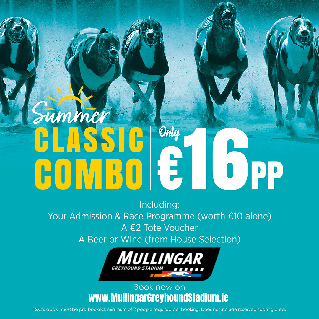 If you'd prefer to book a Restaurant Meal, Finger Food package or Private Suite, please click here to visit Mullingar Greyhound Stadium Restaurant Bookings page.
