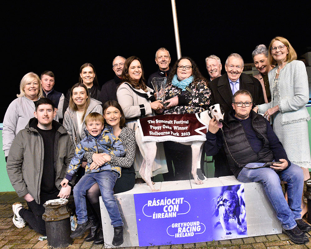 Jennifer Fitzpatrick presents the trophy to Jeanie Comerford after Lets Go Bubbles won the Final of the Suncroft Festival Puppy Oaks at Shelbourne Park. Also included are sponsors Tony and Loraine Howard, Peter, Siobhan, Laura and Gerard Comerford, Andrew Slyman, Mick Lowrey, trainer Owen McKenna, Emma and Oisin Howard and Aineta Kozaowska. Pic: Imelda Grauer
