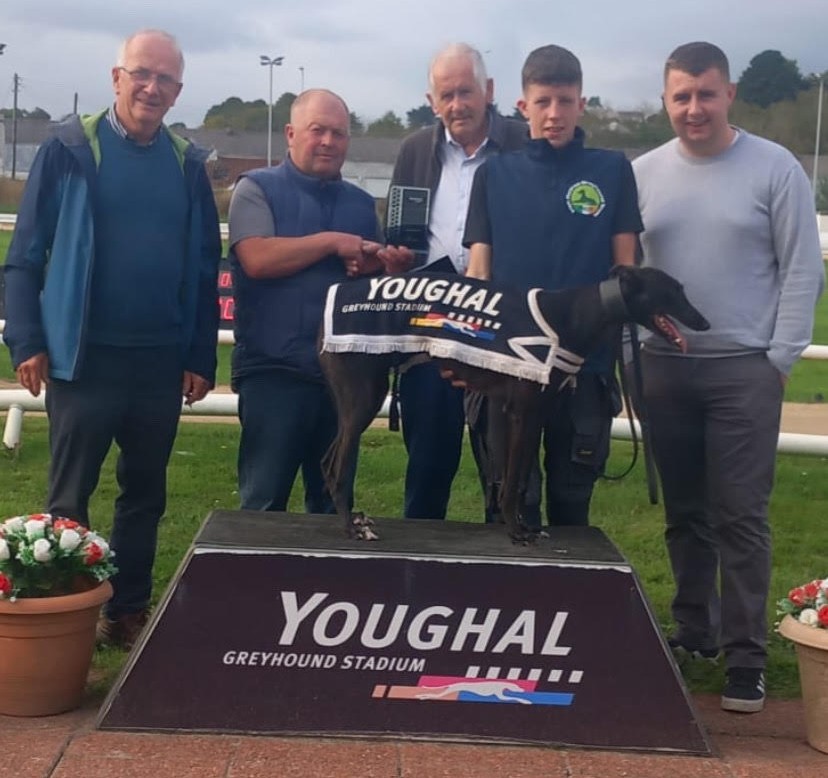 On Tuesday night in Youghal, litter sister Pretty Exile (Pic right:) Pretty Exile with John Hickey & Stevie Motherway (Y.T.S.C) present the winning trophy to Andy Lynch (winning owner).