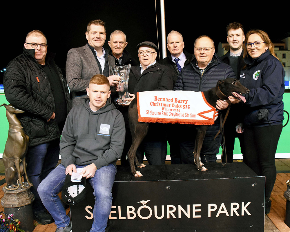 Peter Burke Minister For Enterprise Trade & Employment presents the trophy to Jodie Scally after Silverhill Freya won The 2024 Bernard Barry Christmas Oaks at Shelbourne Park. Also included are sponsor Bernard Barry, Eugene & Jason Buckley, trainer Graham Holland, handler Nickey Holland, Dylan Brennan Racing Manager Shelbourne Park and Richard O'Regan GRI. Pic: Imelda Grauer