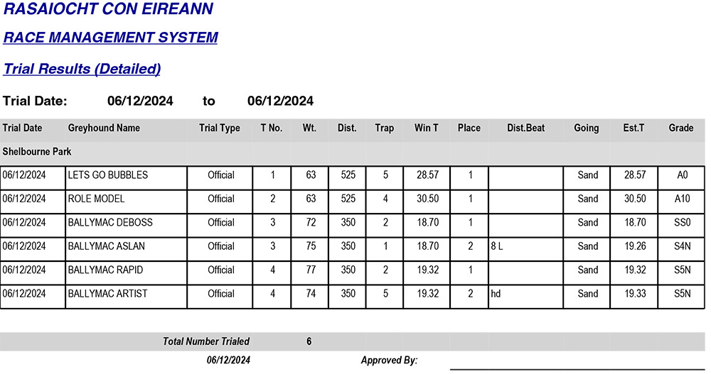 Shelbourne Park Trial Results, Friday 6/12/2024: