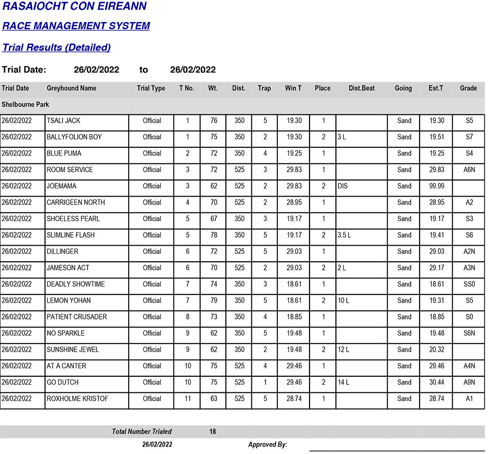 SHELBOURNE PARK TRIAL RESULTS, SATURDAY 26/02/2022