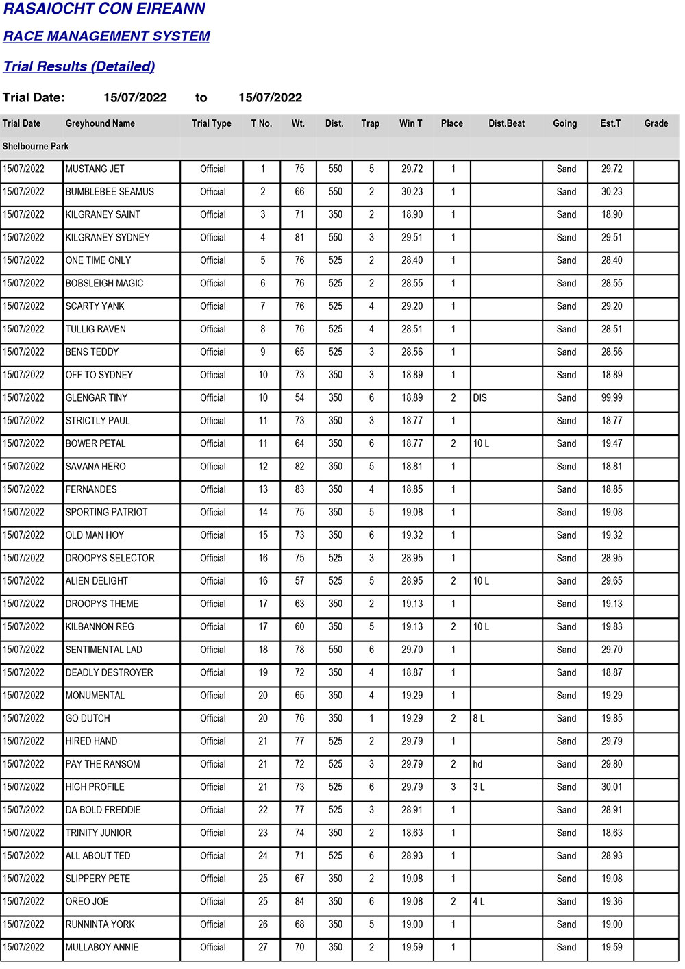 Shelbourne Park Trial Results, Friday 15/07/2022: