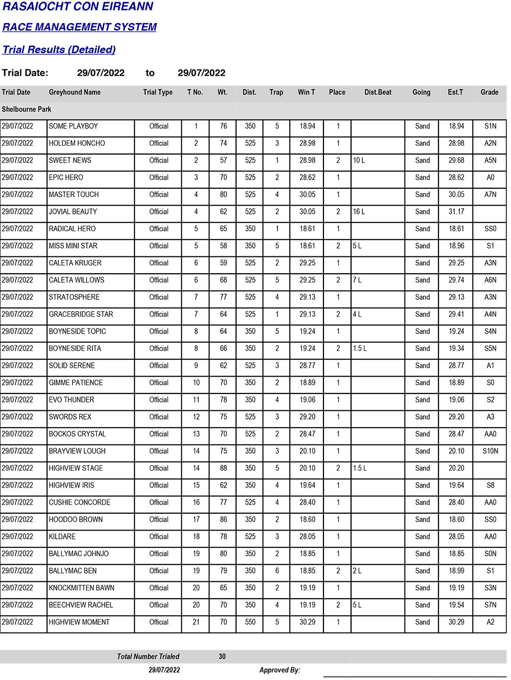Shelbourne Park Trial Results, Friday 29/07/2022: