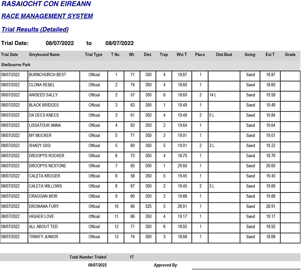 Shelbourne Park Trial Results, Friday 8/07/2022: