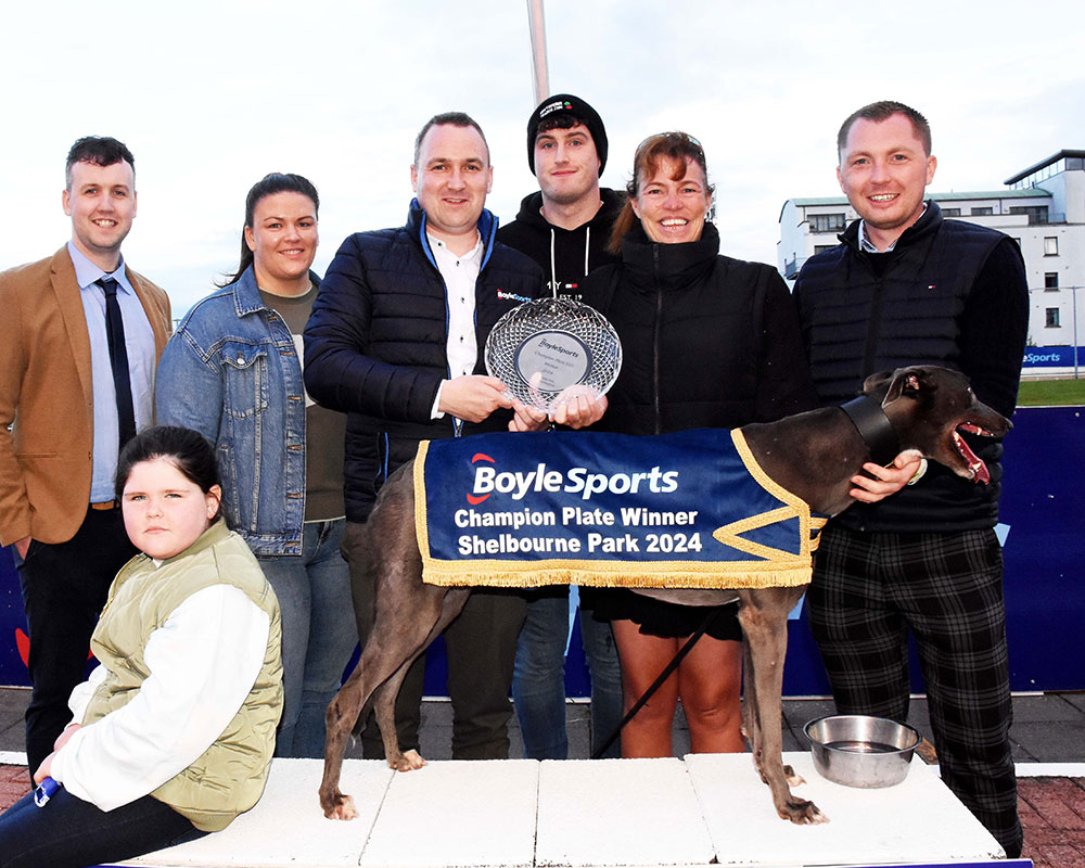 Damien Lonergan representing sponsors BoyleSports presents the trophy to Carol Cranstone after Glengar Martha won the 2024 BoyleSports Champion Plate at Shelbourne Park. Also included are Conor Matthews Acting Racing Manager, Dylan Brennan Racing Support Officer, Kean Hughes, Emma Buckley, Aoibhean and Grainne Murphy and Ciaran O'Sullivan. Pic: Imelda Grauer