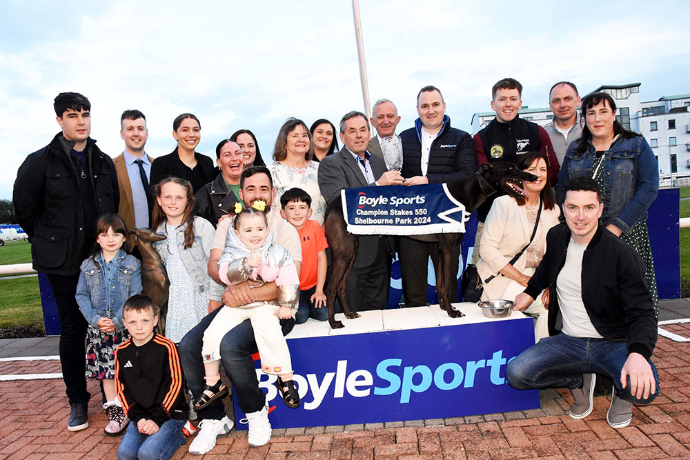 Damien Lonergan representing sponsors BoyleSports presents the trophy to the winning connections of Daleroad Duke winner of the 2024 BoyleSports Champion Stakes at Shelbourne Park. Also included are Dylan Brennan Racing Support Officer, Conor Matthews acting Racing Manager, trainer Pat Guilfoyle and the Guilfoyle and O'Keeffe families. Pic: Imelda Grauer
