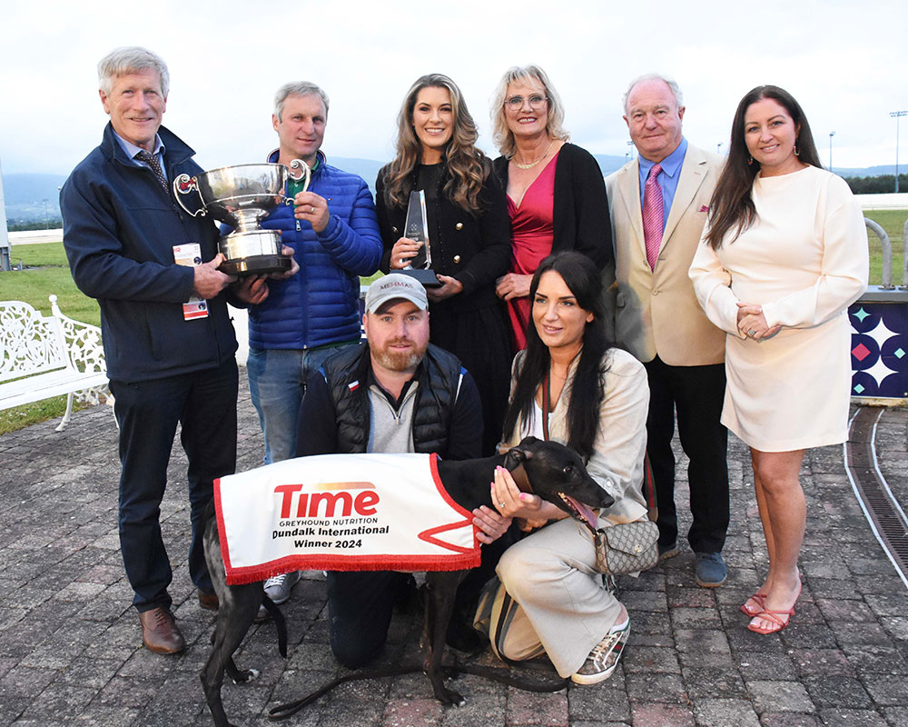 John Fox presents the trophy to Alan Dobbs after Droopys Mandolin won the 2024 Time Dundalk International. Also included are trainer Robert Gleeson, Jennifer Traynor, Caitriona Fox, Maria Ryan, Catriona Byrne GRI, and Leo McAuley Track Director. Pic: Imelda Grauer