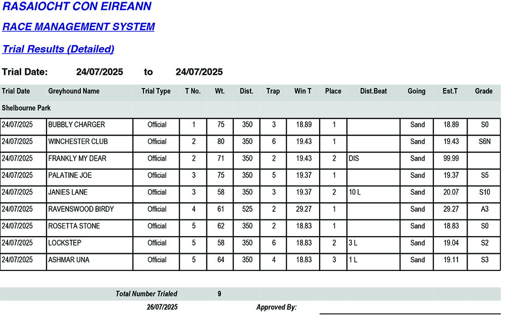 Shelbourne Park Trial Results Thursday 24/07/2025: