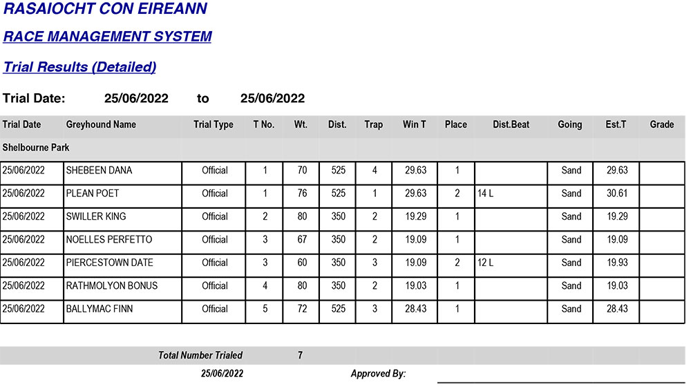 Shelbourne Park Trial Results, Saturday 25/06/2022: