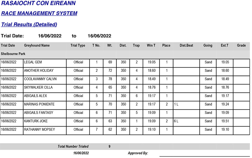SHELBOURNE PARK TRIAL RESULTS, THURSDAY 16/06/2022