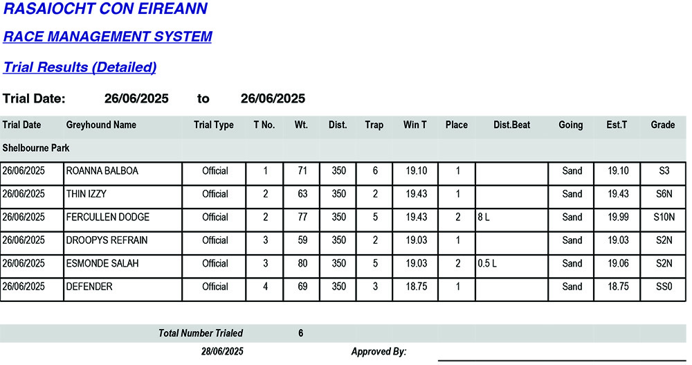 Shelbourne Park Trial Results Thursday 26/06/2025: