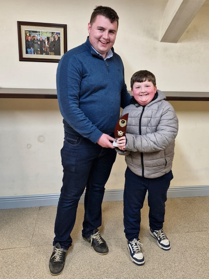 The well backed 5-4 favourite took up the running before the opening corner and in truth, the outcome was never in any doubt. Such a strong and powerful performer, the classy lady displayed bundles of pace up front and she took the feature A1 contest in fantastic style. Penny has now won her last six around the seaside venue and she beat Deelish Tyson, by four lengths. (Pic right:)) Young owner Caelan Franey receiving his trophy from Racing Manager Ian Magnier last night. Caelan is a big part of the Kevin McLean training operation and Caelan had his first ever runner with Nellie Buckets last night. Best of luck going forward, Caelan.