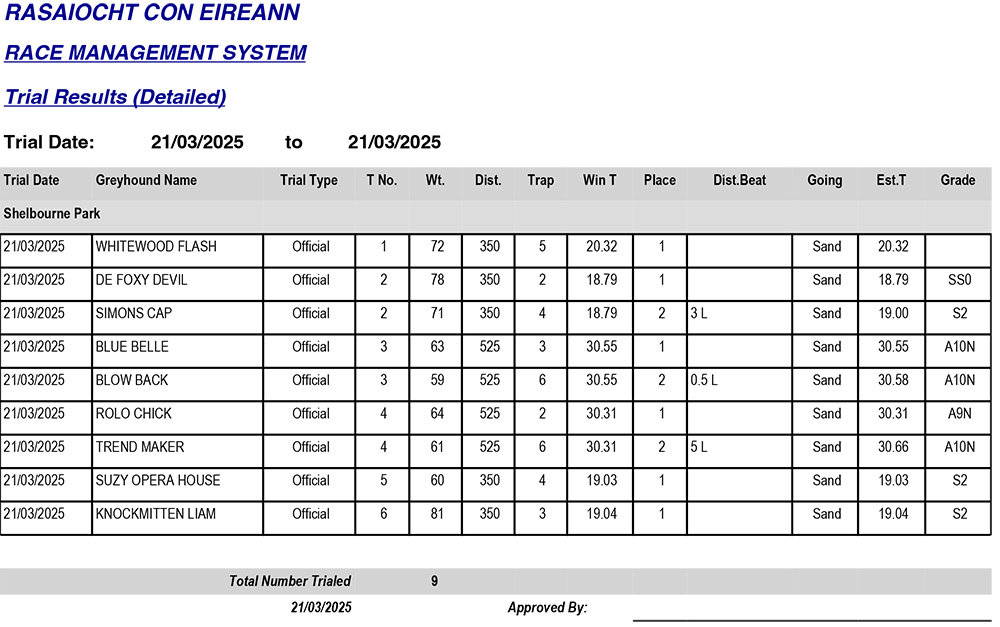 SHELBOURNE PARK TRIAL RESULTS, FRIDAY 21/3/2025