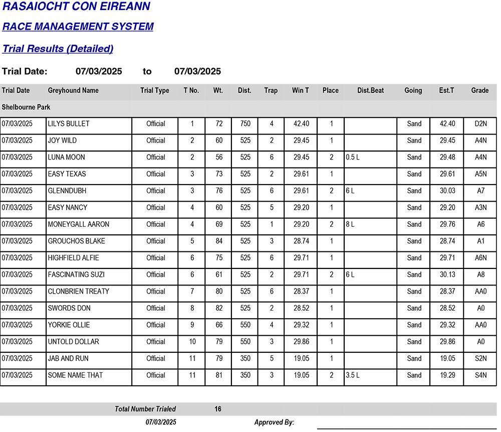 Shelbourne Park Trial Results, Friday 7/3/2025: