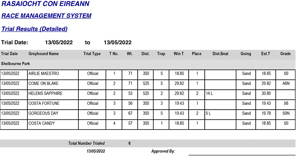 Shelbourne Park Trial Results, Friday 13/05/2022: