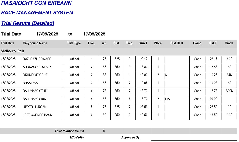 SHELBOURNE PARK TRIAL RESULTS SATURDAY 17/05/2025