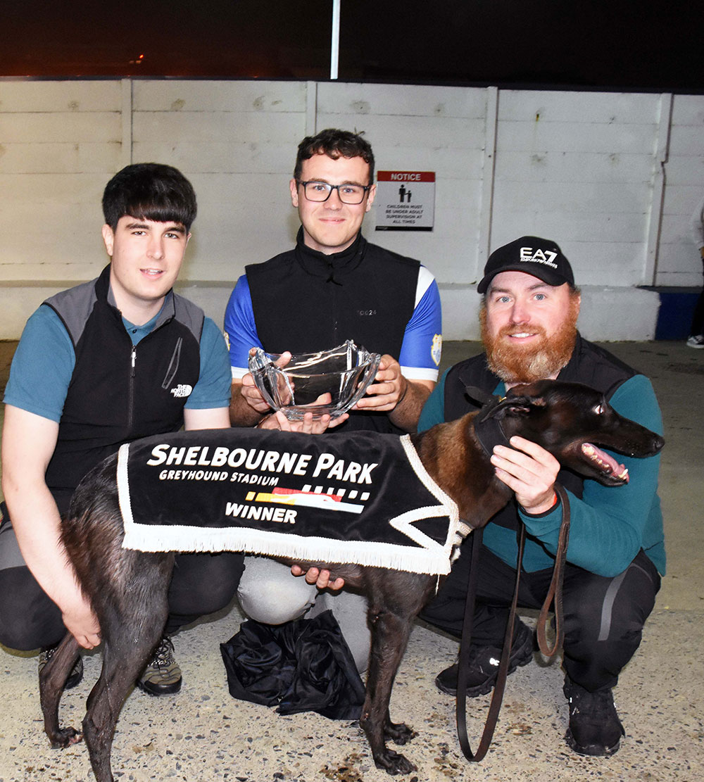 Representing the Robert Gleeson/ Paul Allen combination, the son of Malachi and Droopys Charm broke on terms and held a narrow lead into the turn before swinging wide. Despite this, he held on to his advantage and once straightening up, started to put daylight between himself and his nearest pursuer, the reserve, Coolavanny Bruno. (Pic right: Conor Matthews Racing Support Officer Shelbourne Park presents the trophy to Lorcan O'Reilly after Droopys Deploy won Talking Dogs On Monday ON1 525 Final. Also included is trainer Robert Gleeson.) Pic: Imelda Grauer