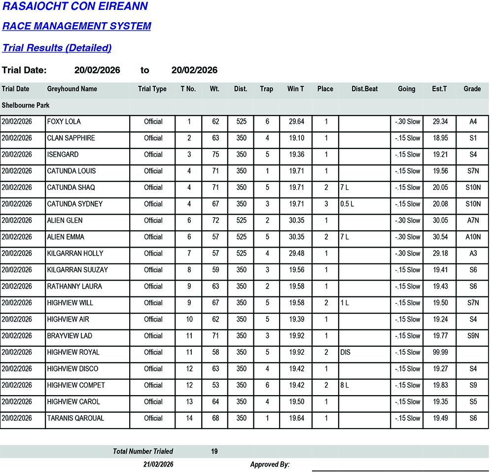 Shelbourne Park Trial Results Friday 20/2/2026: