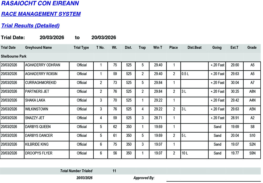 Shelbourne Park Trial Results Friday 20/3/2026: