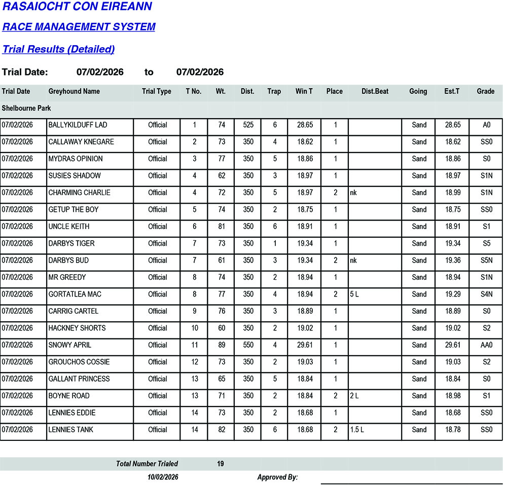 Shelbourne Park Trial Results Saturday 7/2/2026: